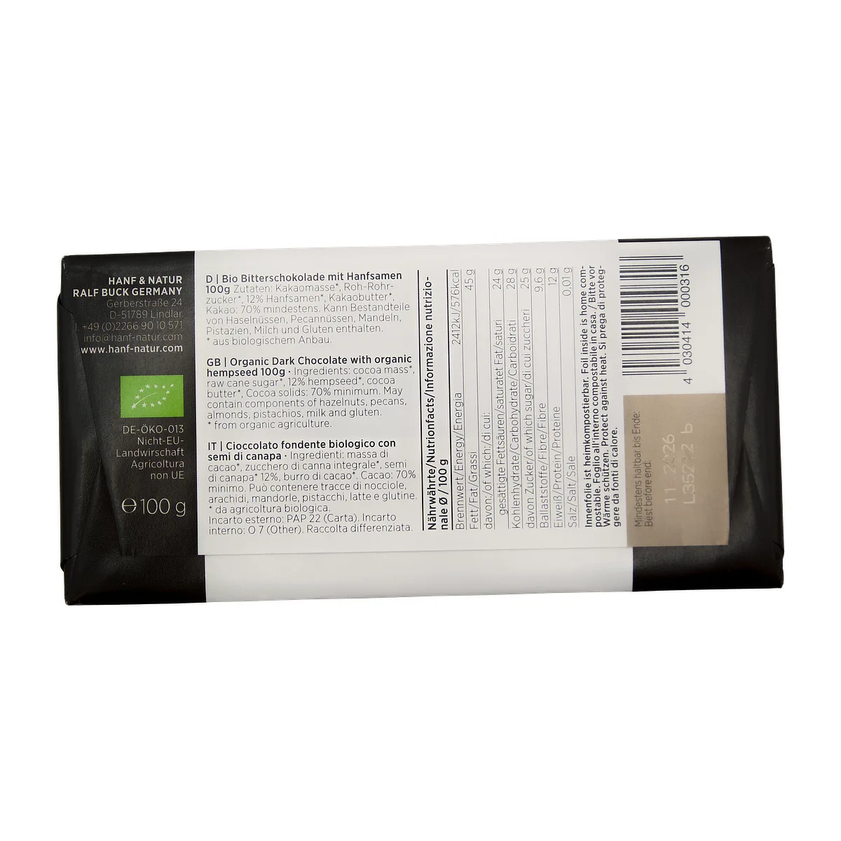 Hanf & Natur har fler än 25 års erfarenhet av att lyfta fram hampans positiva egenskaper som livsmedel och smakbärare. Hanf Natur Med fokus på ekologiskt och hållbart arbete har de skapat ett sortiment där hampan får glänsa – och här i kombination med fin mörk choklad blir resultatet både smakfullt och medvetet.